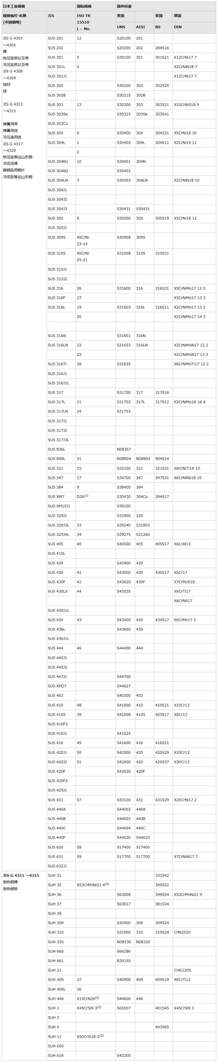 备注1.ISO根据ISO TR15510:1997。记号和EN显示相同。但是,(1)为根据ISO4954、(2)为根据683·15。